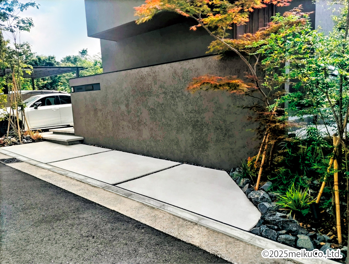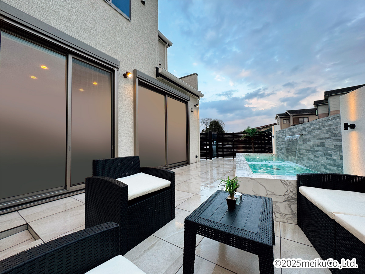 山の稜線と緑に囲まれたプライベート空間。本来ならば人の暮らしが見える場所。現実の風景を巧みにそっと隠し、望む景色だけが映るよう施工しました。