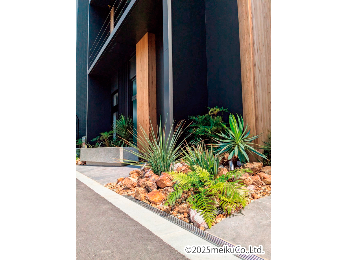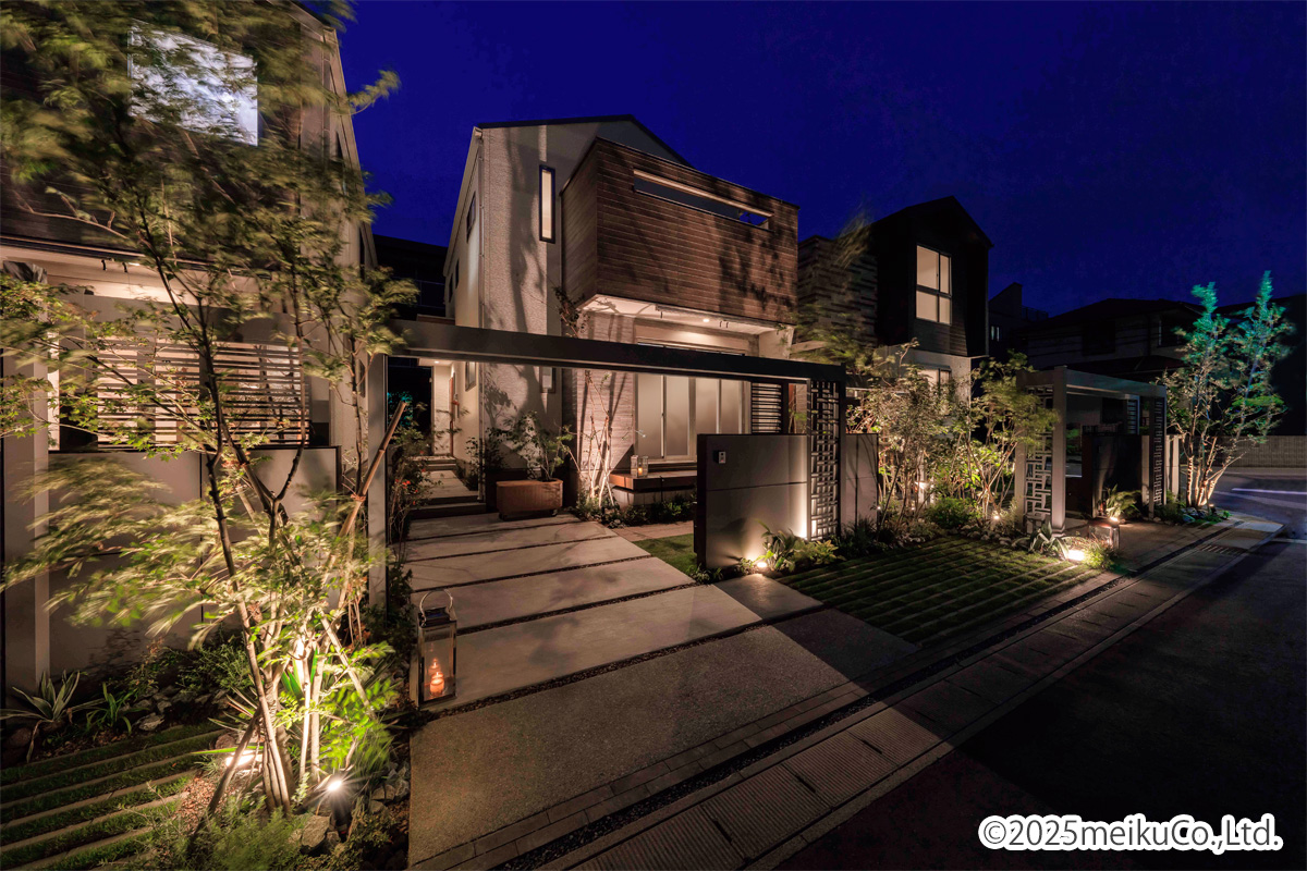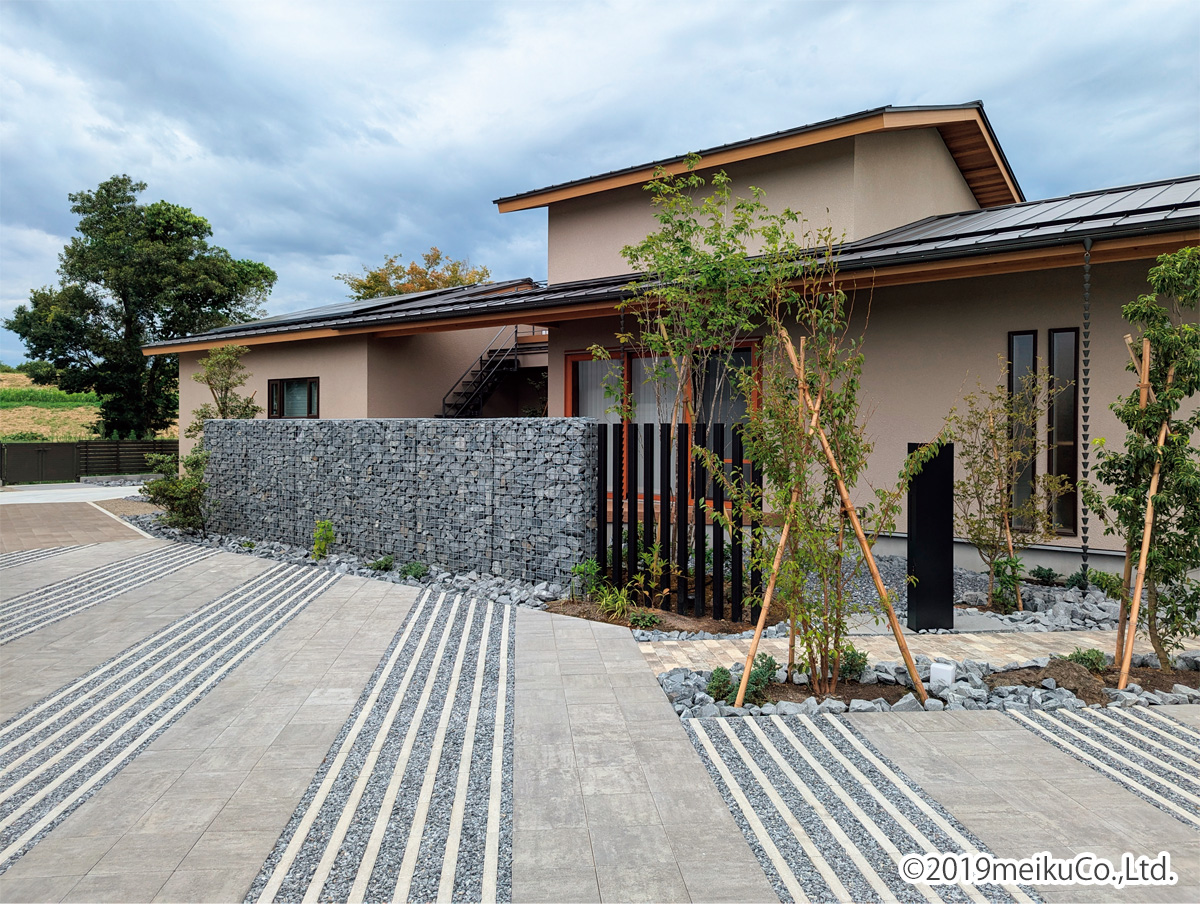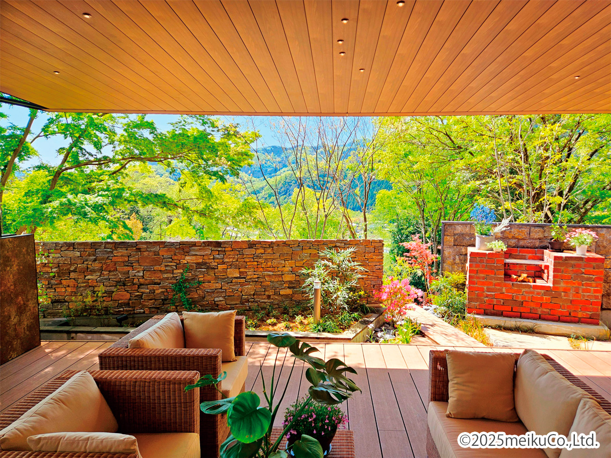山の稜線と緑に囲まれたプライベート空間。本来ならば人の暮らしが見える場所。現実の風景を巧みにそっと隠し、望む景色だけが映るよう施工しました。