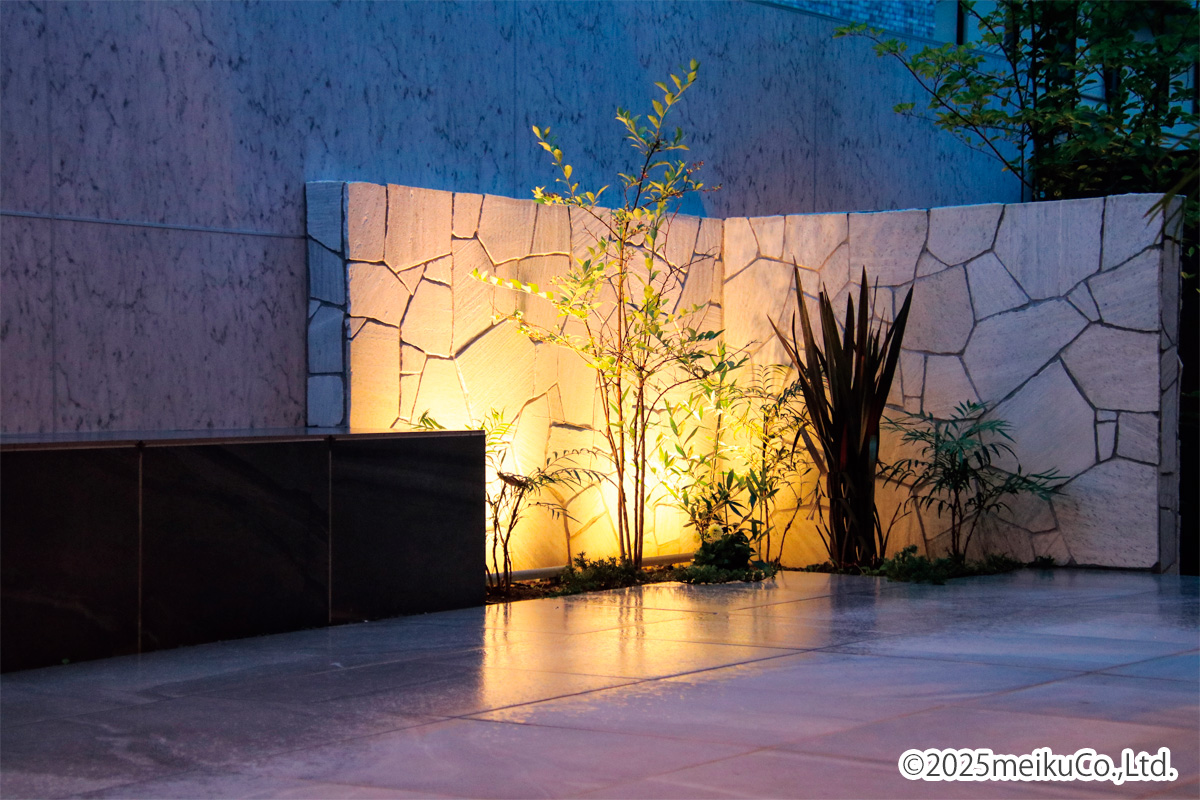 BBQ炉を彩る石壁・オリエンタルレガシーの重厚な存在感は、ゆらめく炎と調和し、自然の力強さとあたたかな時間を引き立てます。
